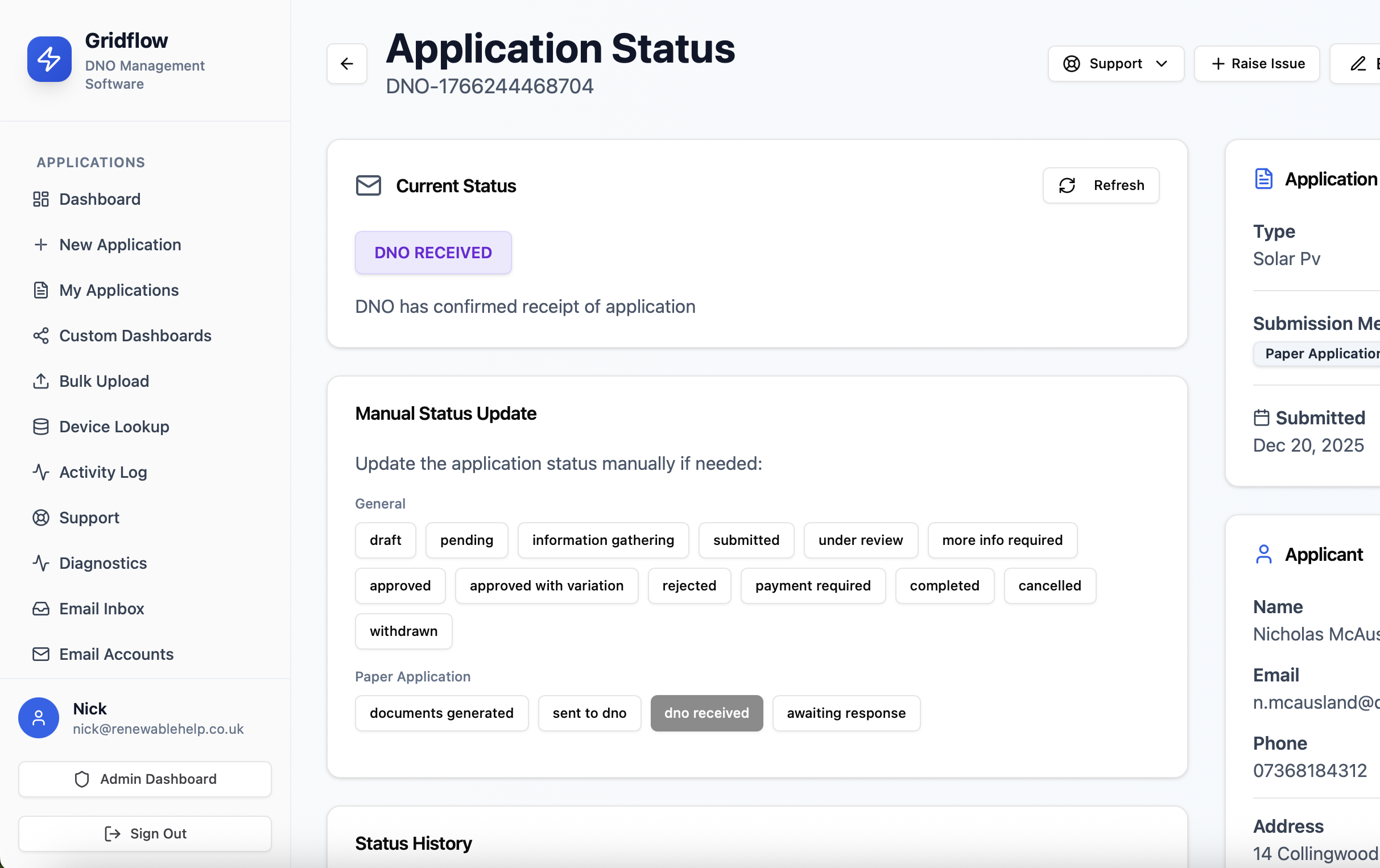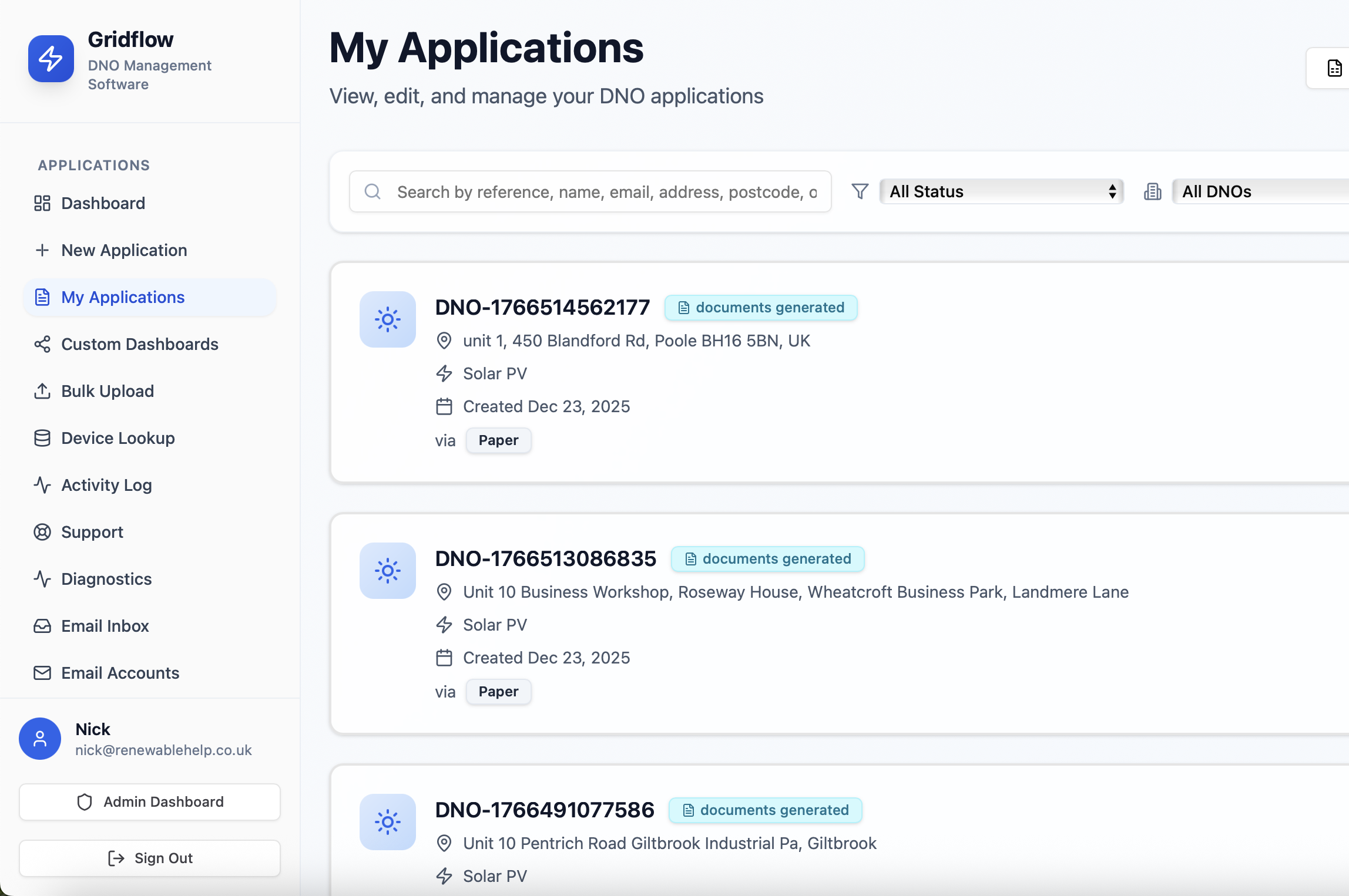 DNO management software that keeps all solar, EV, and heat pump grid notifications and DNO applications organised in one place.
